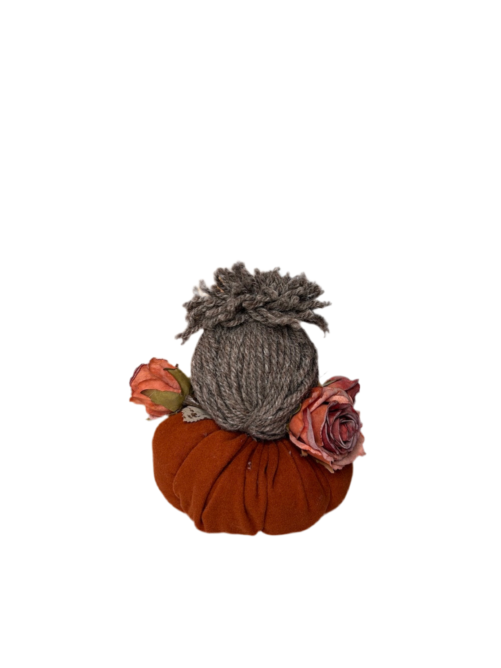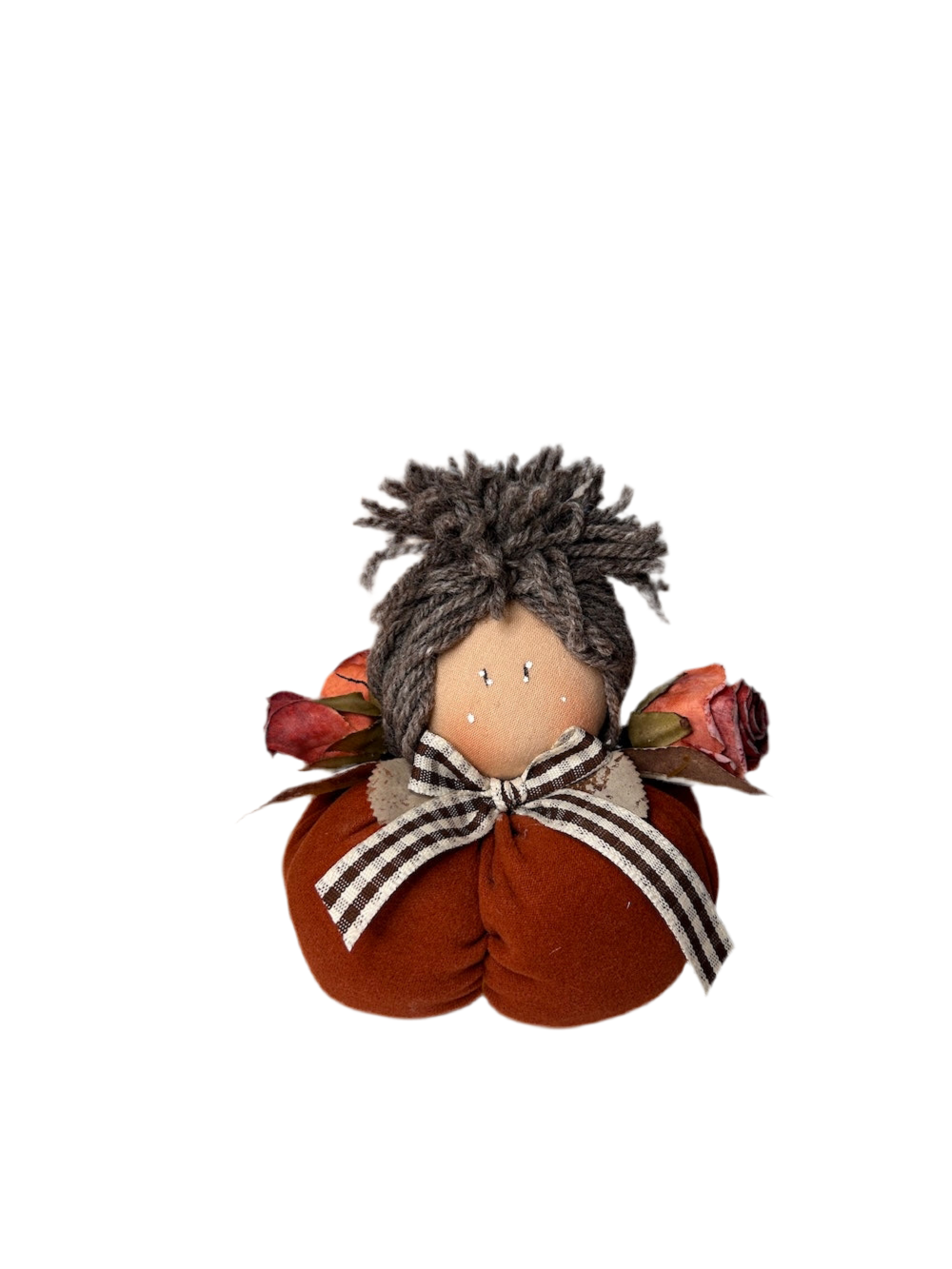 Un’idea creativa e raffinata che unisce la magia dell’autunno alla delicatezza dell’artigianato: questa zucchetta in velluto diventa il corpo di una dolce bambolina decorativa, arricchita da fiori coordinati nei toni caldi della zucca.