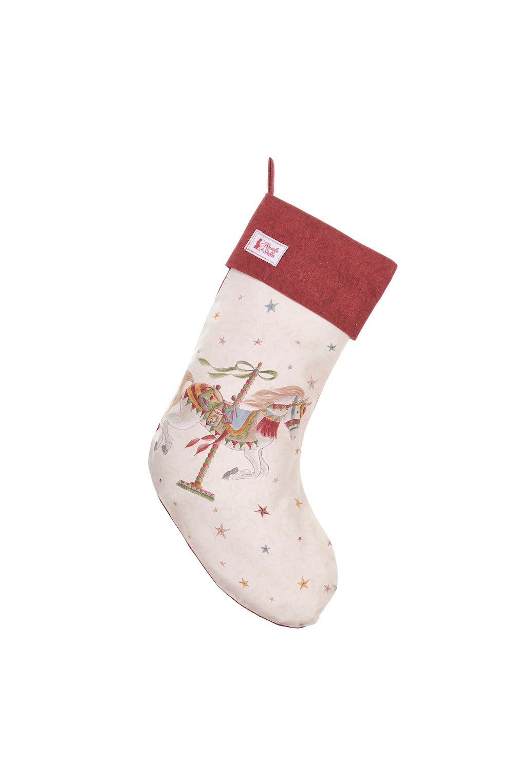 Un tocco di magia e tradizione per le tue feste: la calza natalizia della linea Giostra è realizzata con tessuti di qualità e decorazioni raffinate che richiamano l’atmosfera incantata del Natale. Perfetta da appendere al camino, all’albero o in qualsiasi angolo della casa, diventa un dettaglio unico capace di unire stile, allegria e tradizione.