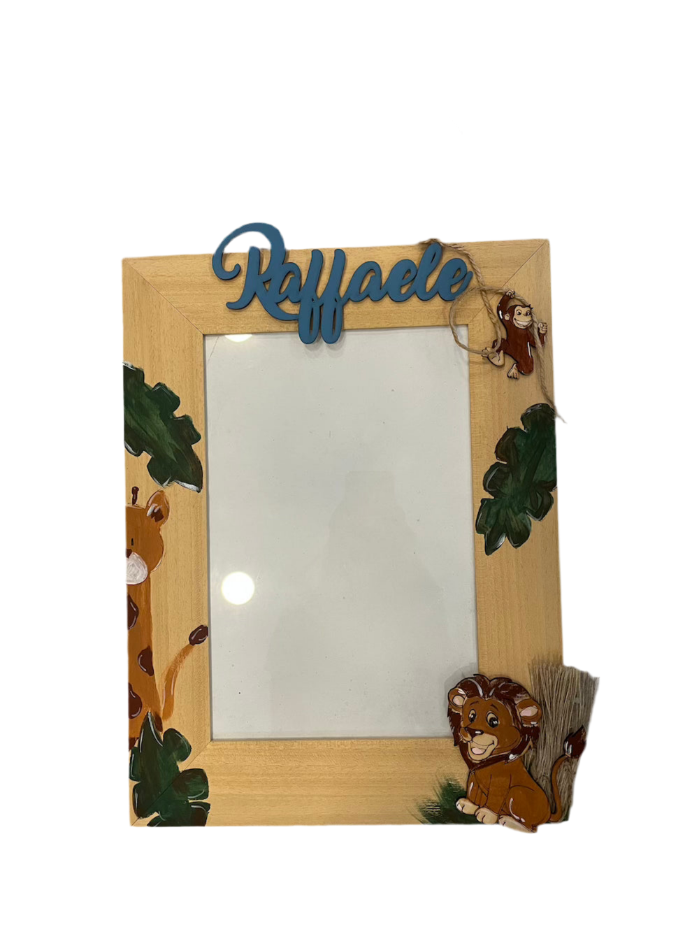 Cornice artigianale in legno naturale, decorata con motivi ispirati alla giungla. Un accessorio unico per dare carattere e originalità alle tue pareti.