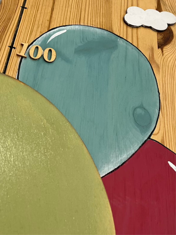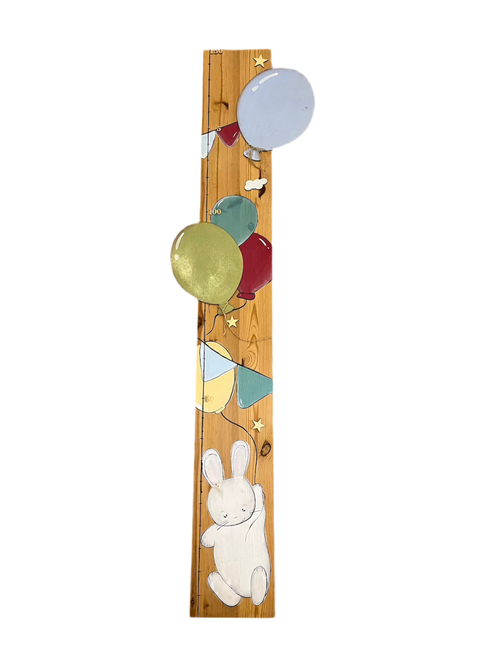 Presentiamo il nostro incantevole metro in legno per bambini, ornato con festoni, palloncini e un tenero coniglietto.. Un'aggiunta gioiosa per misurare la crescita dei più piccoli!"
