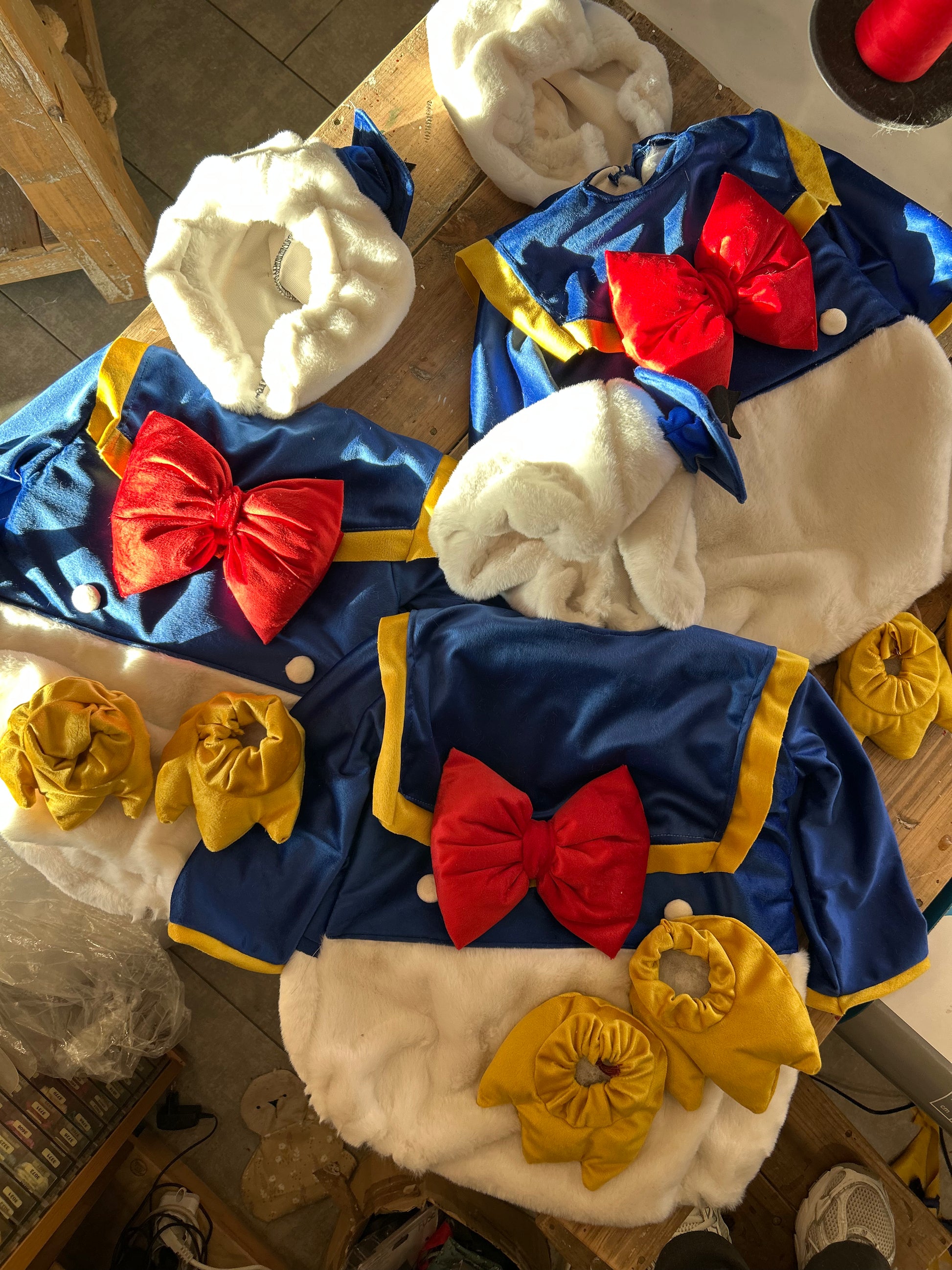 Vestito artigianale di Paperino, realizzato a mano su ordinazione, con cura e materiali di qualità.