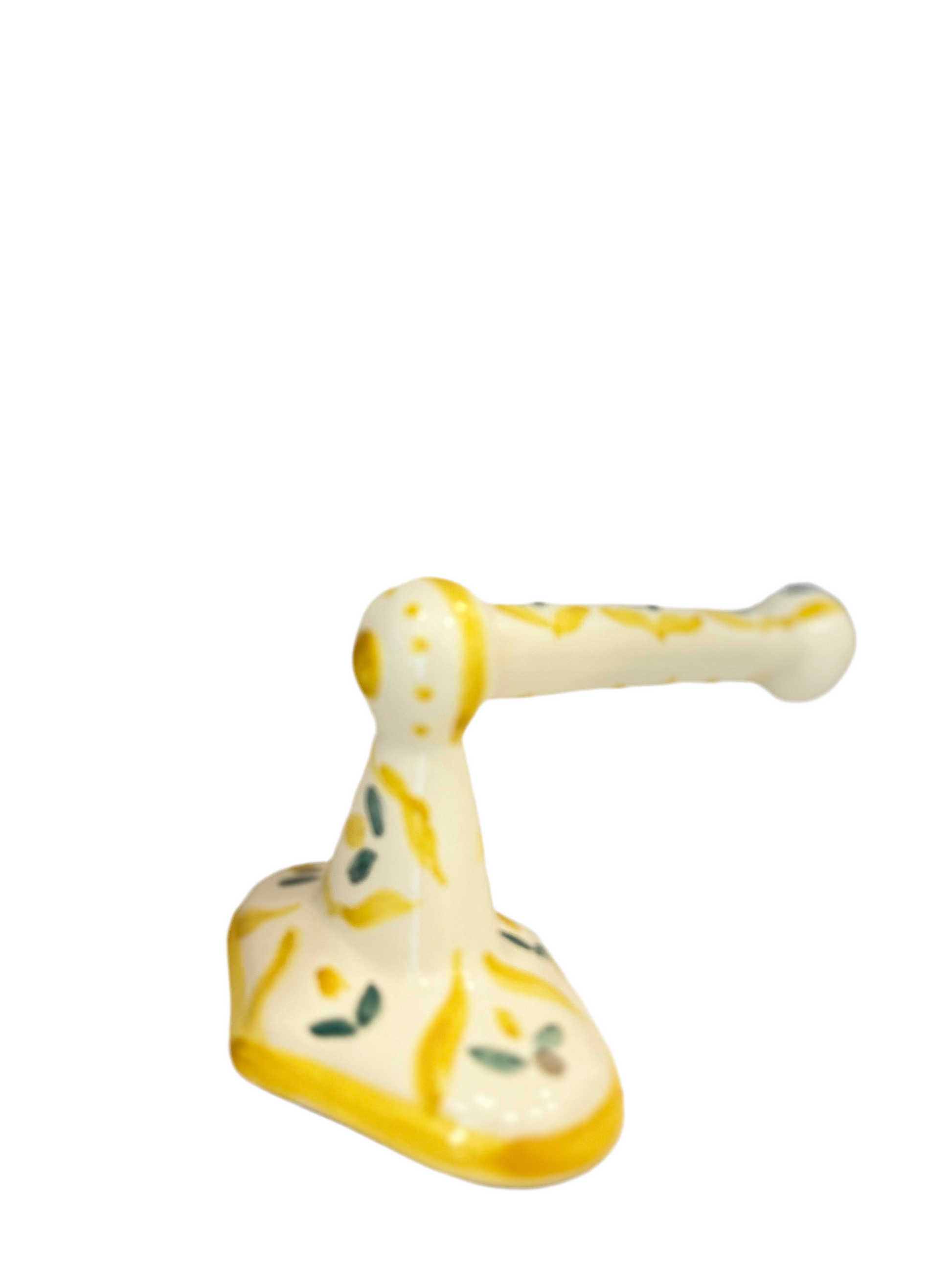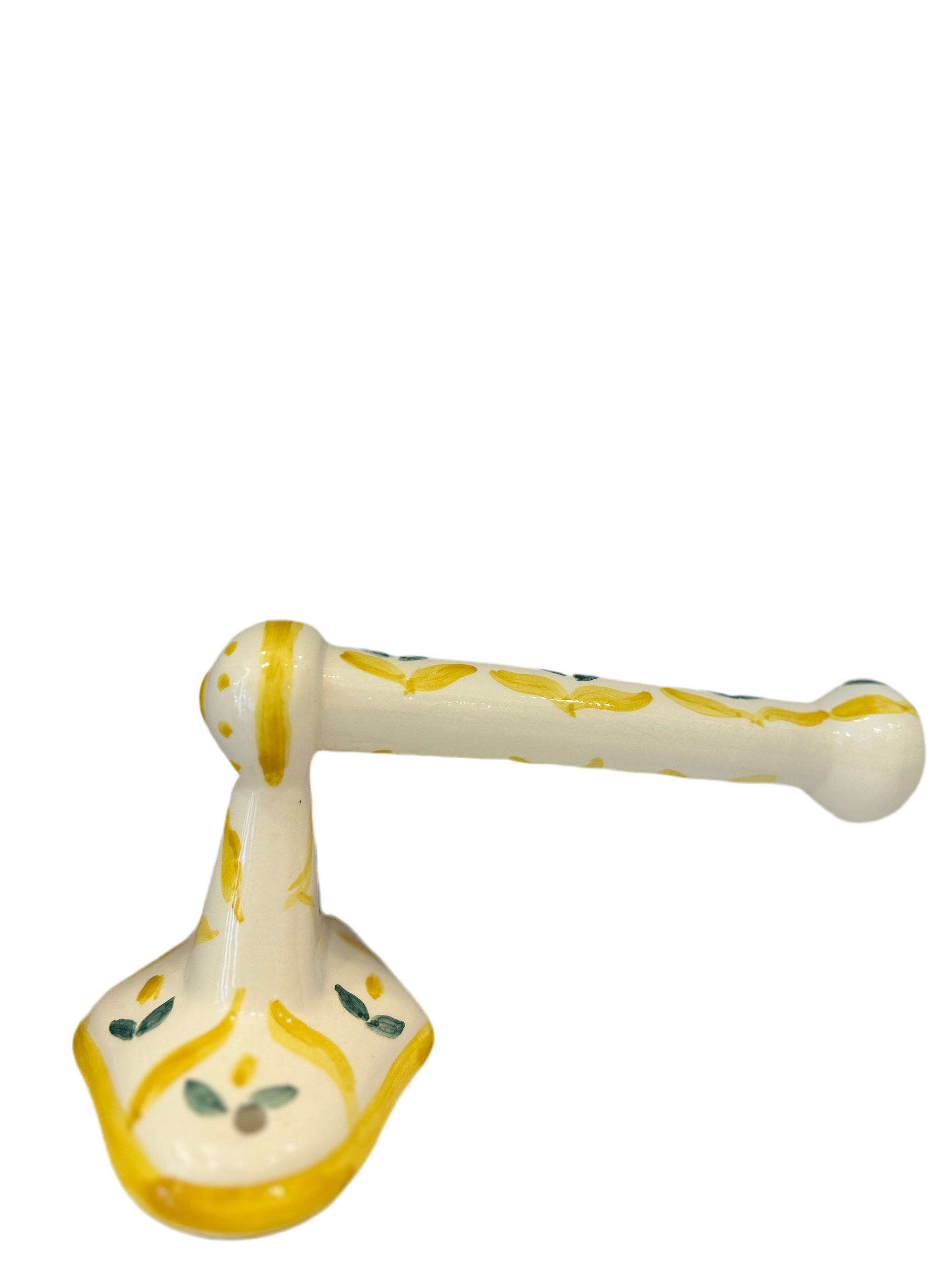 Porta rotolo in ceramica artigianale, decorato a mano con motivi di limoni e foglie verdi su fondo bianco. Perfetto per aggiungere un tocco mediterraneo ed elegante al bagno o alla cucina. Un pezzo unico che unisce funzionalità e tradizione.