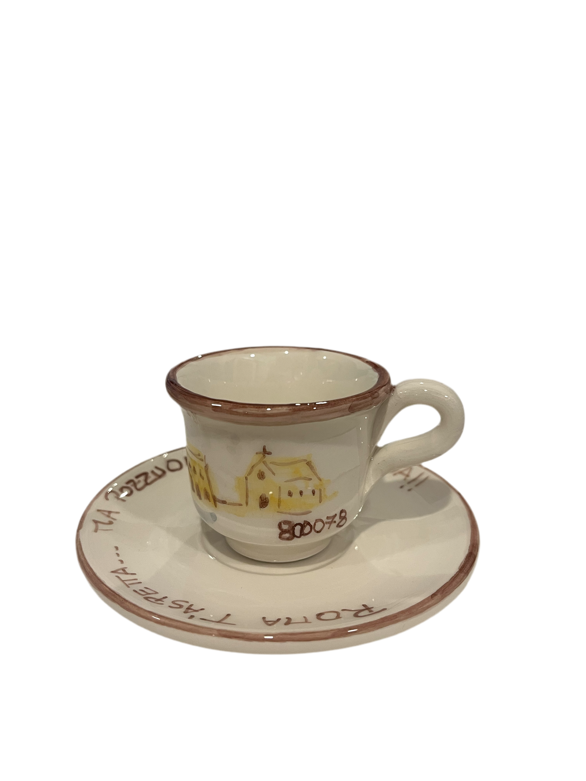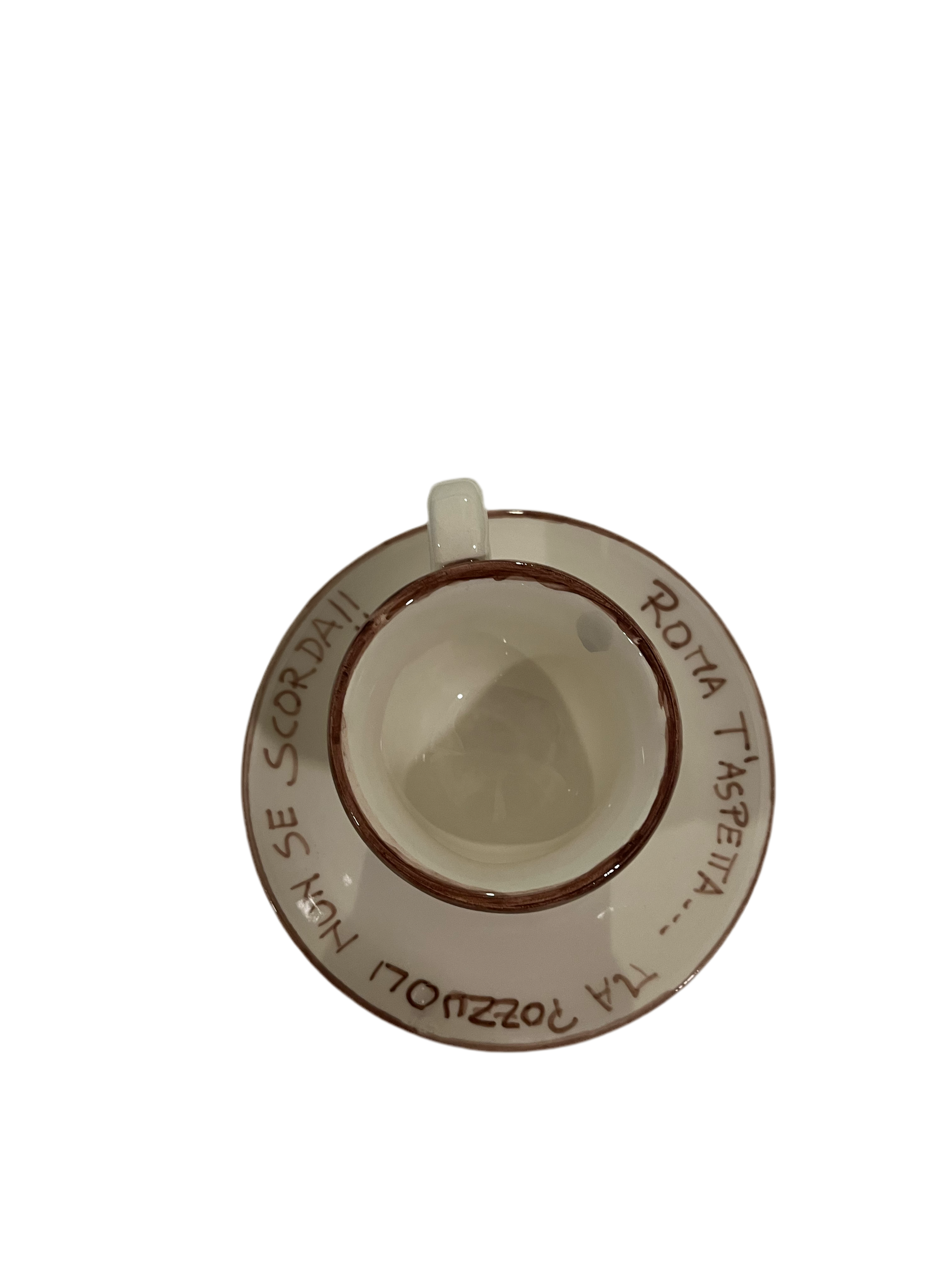 Tazzina con piattino in ceramica, decorata con illustrazioni di Pozzuoli. Personalizzabile con la tua frase preferita. Pezzo unico per momenti speciali.
