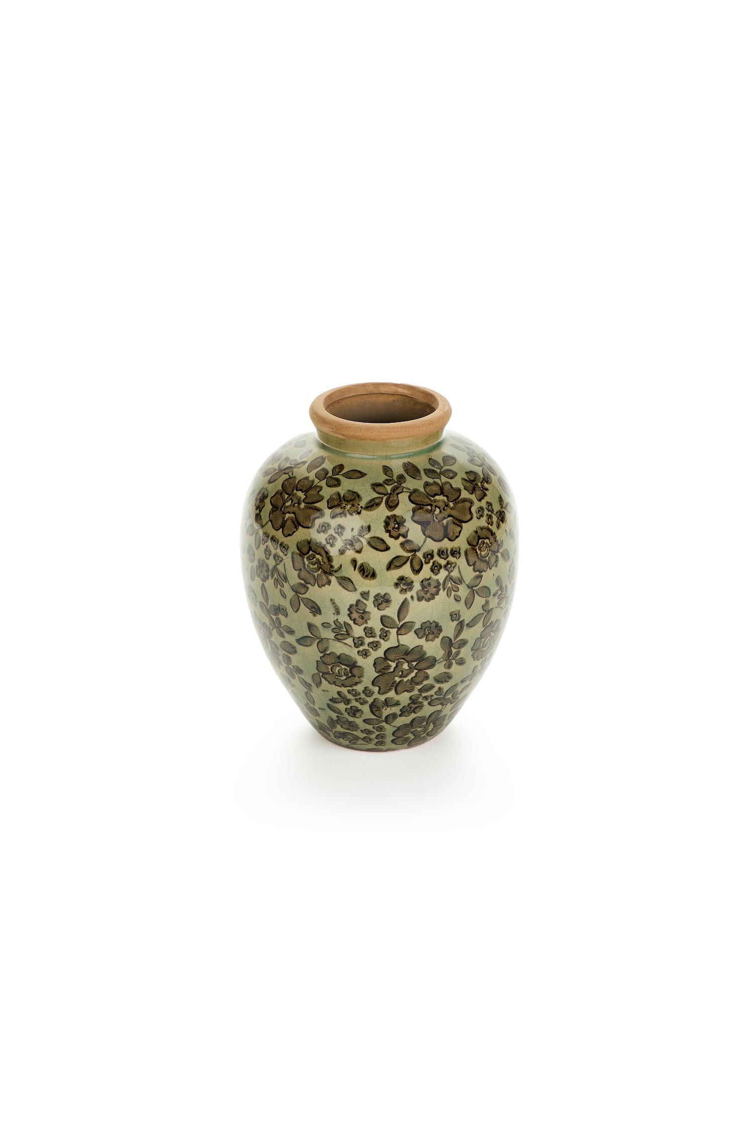 Vaso artigianale in terracotta, decorato con fantasia floreale verde su linea “Nuvola di Soffa”. Elegante e naturale, perfetto per arredare con stile ogni ambiente.